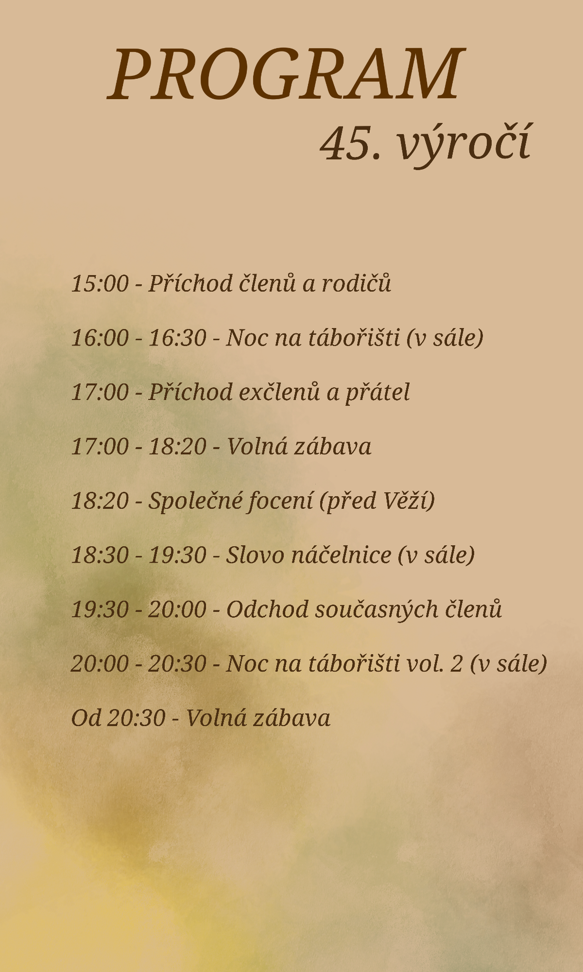 Vzhledem k velkému množství pozvaných, jsme začátek akce rozdělili do dvou časů. Doporučený čas příchodu pro současné členy a jejich rodiče je od 15:00. Doporučený čas příchodu pro ostatní je od 17:00. Hlavní program výročí začne v 18:30 hodin.